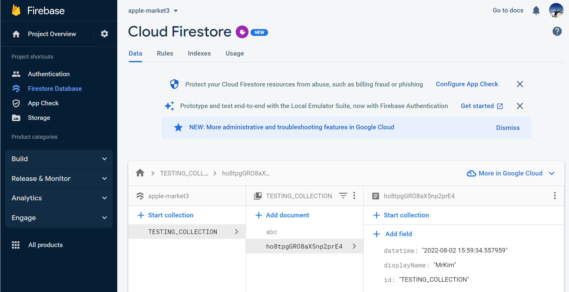 - FirebaseFirestore.instance.collection('TESTING_COLLECTION').add({임의 데이터});
