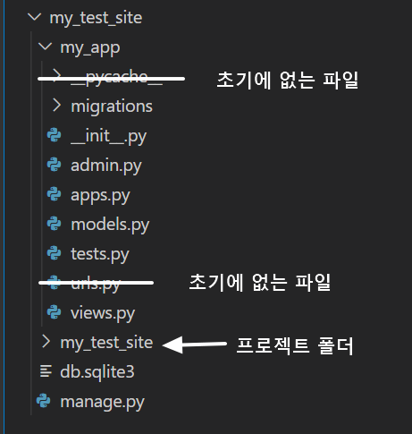 아래 구조로 프로젝트가 생성됨. my_test_site 이름으로 2개의 폴저가 생긴다.