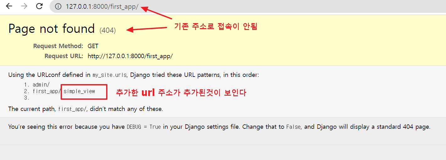 # 생략한 부분을 추가하면, 프로젝트 path('first_app/') + 앱url path('simple_view') 로 구성된다.