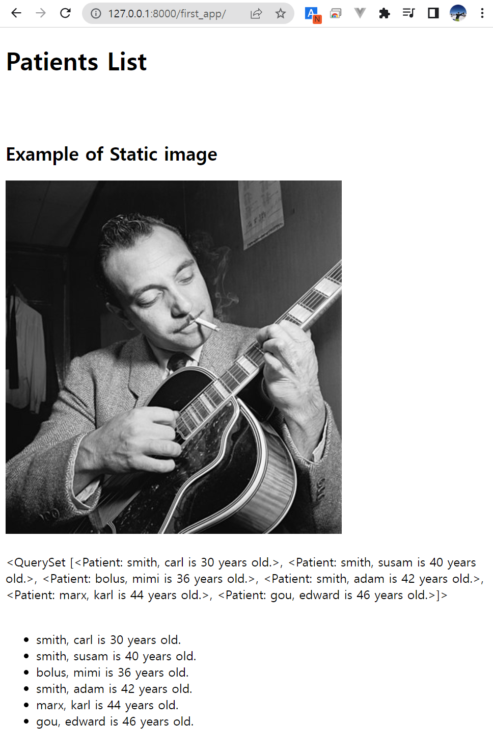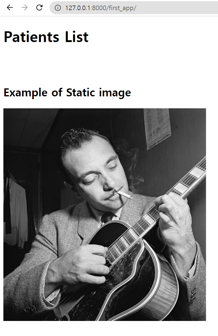 <img src='{% static "first_app/django.jpg" %}' alt = 'my image'> <!-- # <== 코드 추가 -->