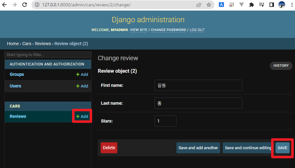 admin 유저를 이용하여 admin 페이지에서 새로 생성한 모델에 데이터를 입력가능하다