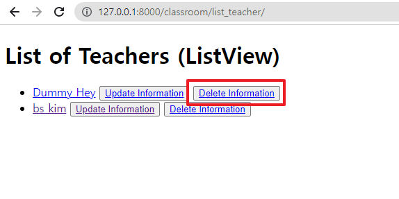 views.py 에서 DeleteView 임포트, TeacherDeleteView 인스턴 생성 - class TeacherDeleteView(DeleteView):