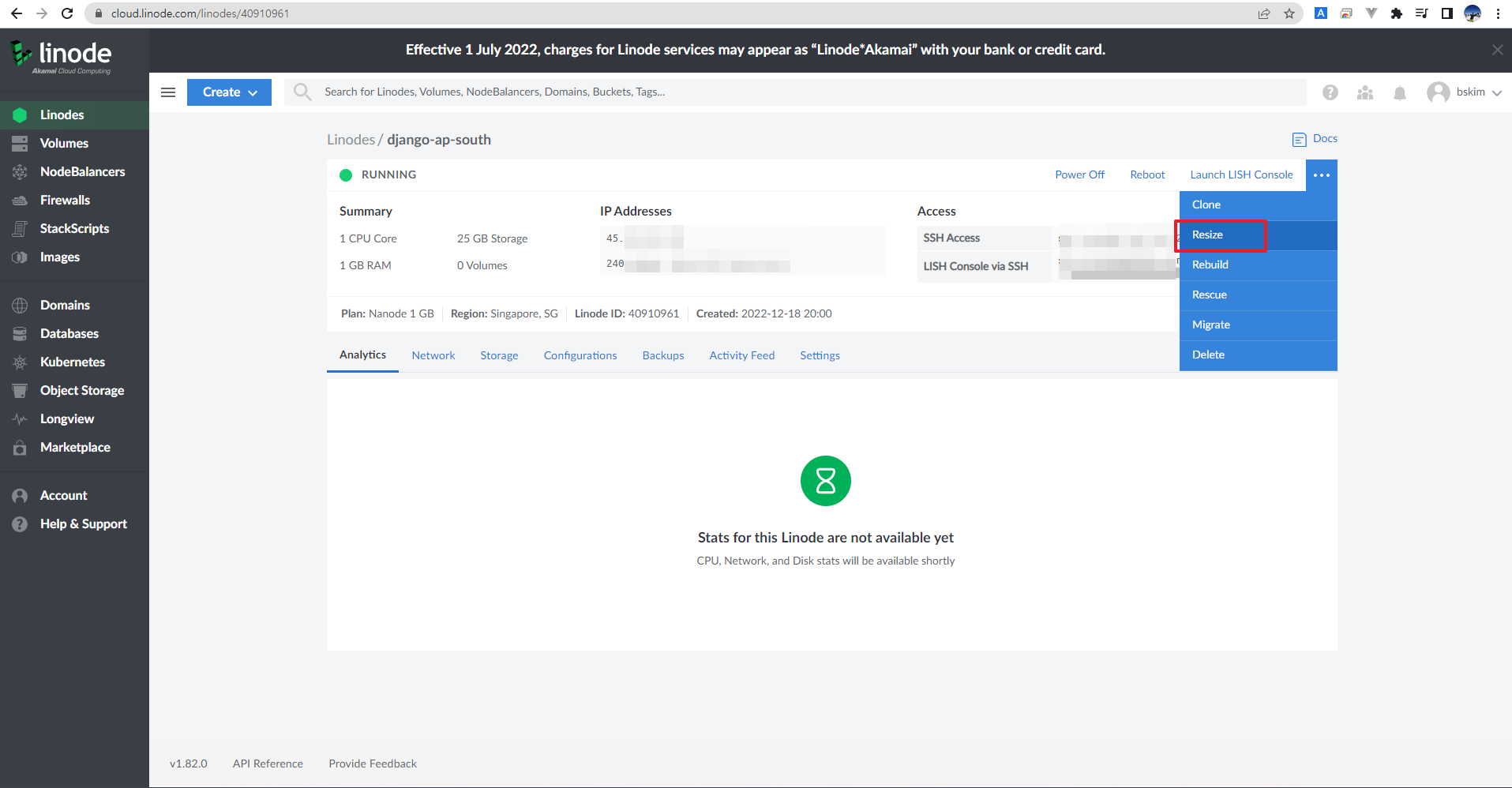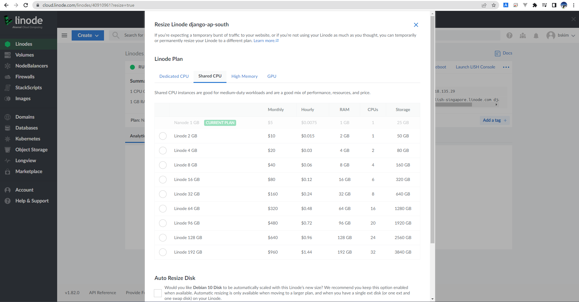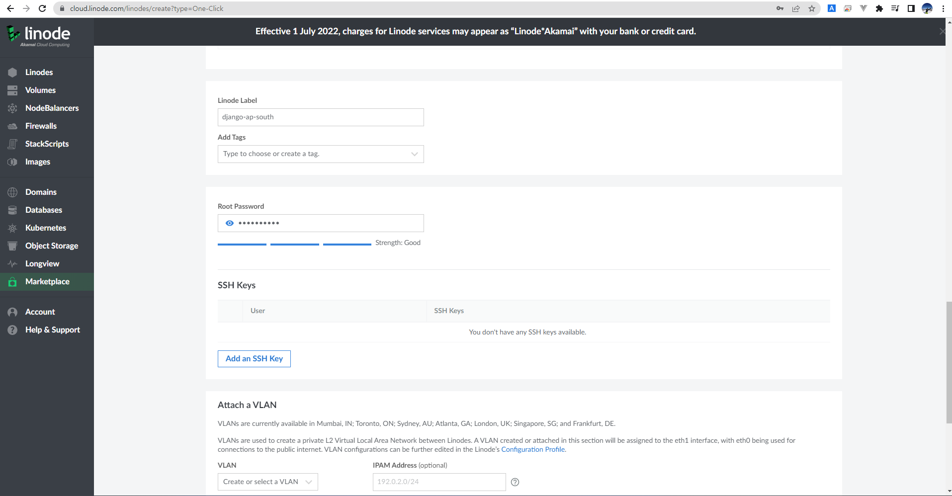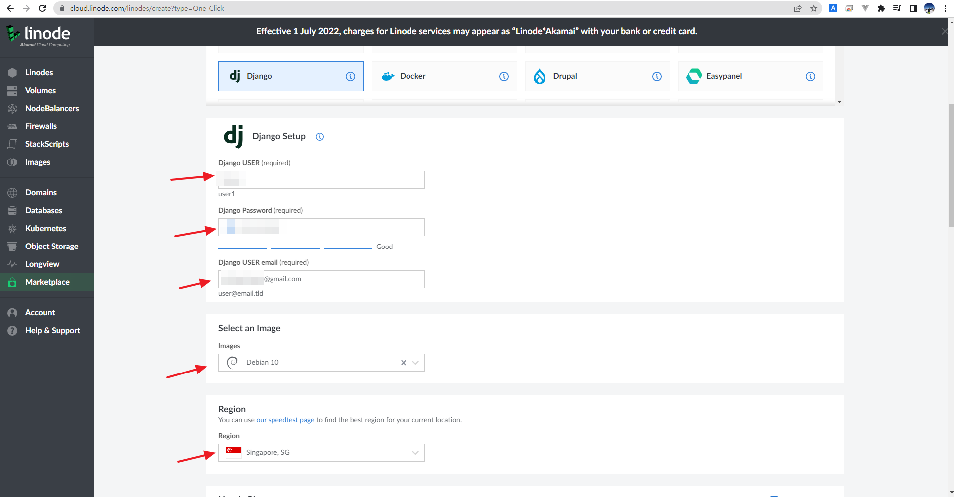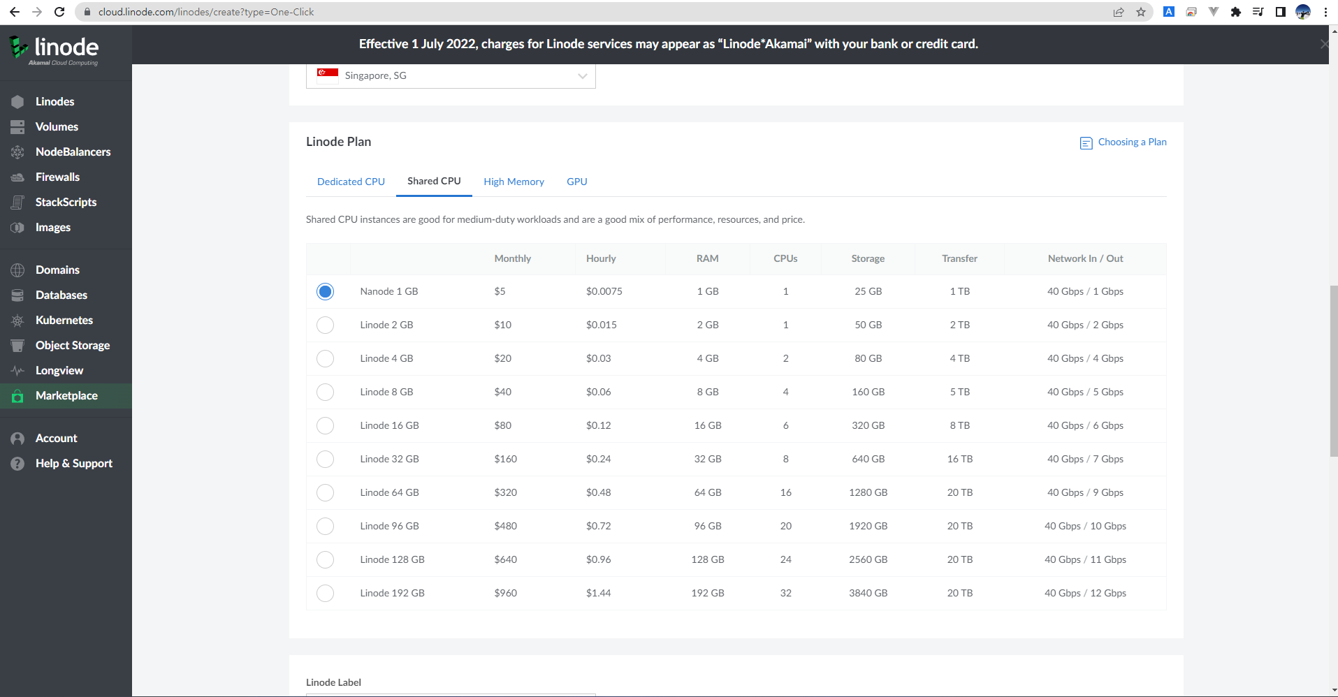 linode 로그인 후 서비스 추가하는 방법, 아래 그림처럼 설정하면 됩니다.