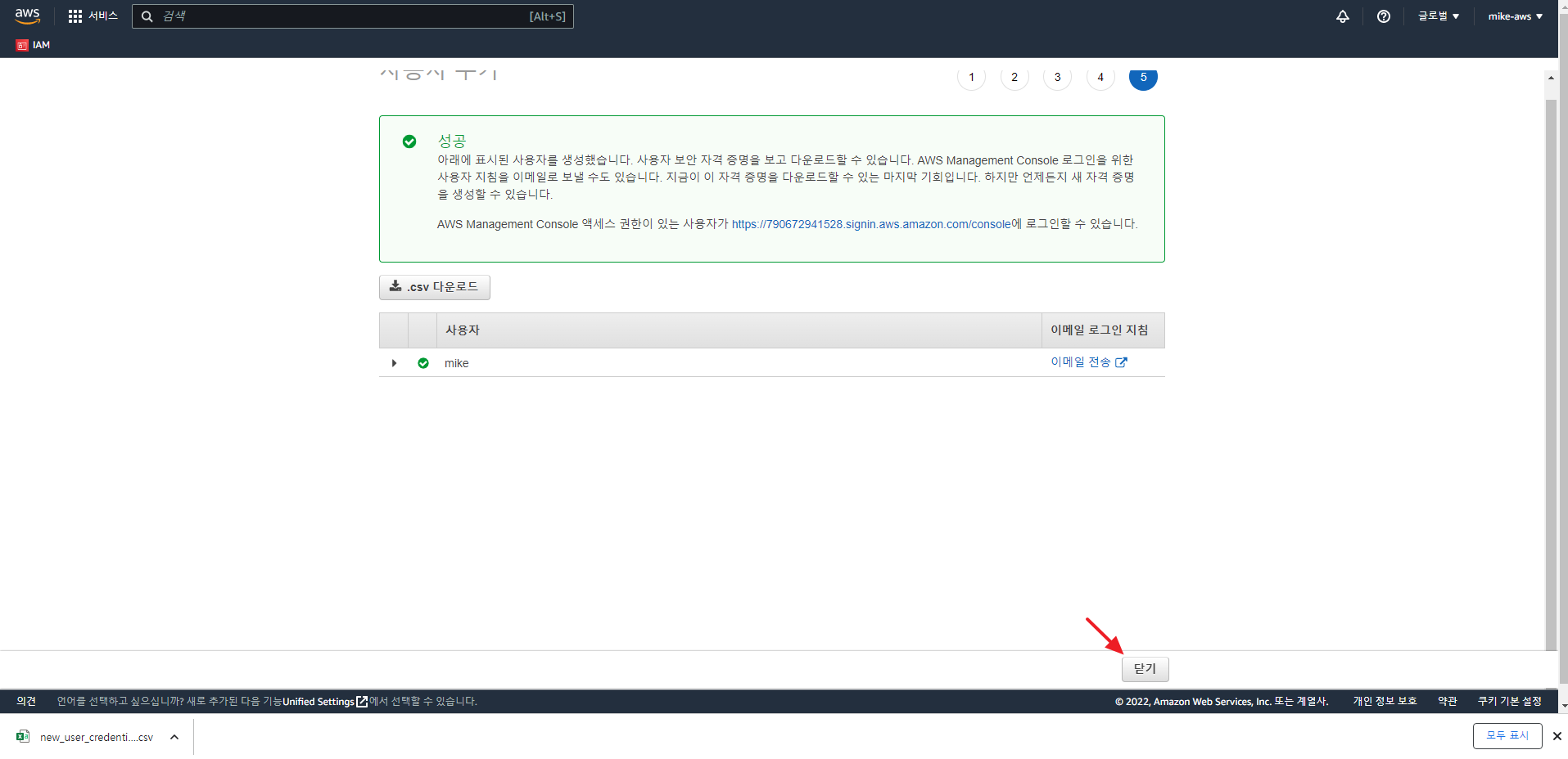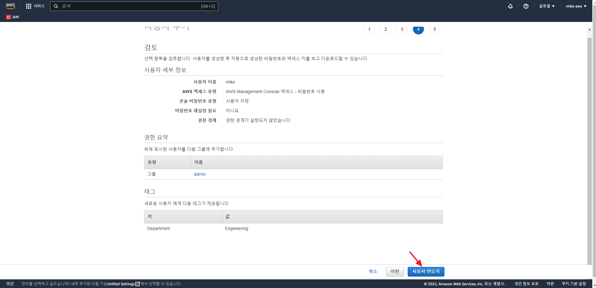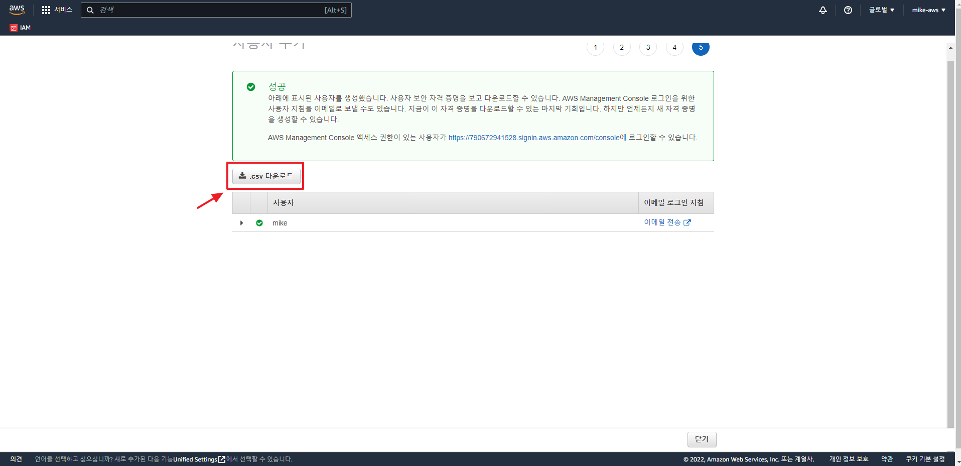 이전 블로그에서 만든 계정으로 로그인을 먼저하고 IAM 이라는 메뉴를 찾아서 아래와 같은 절차로 사용자를 생성한다.