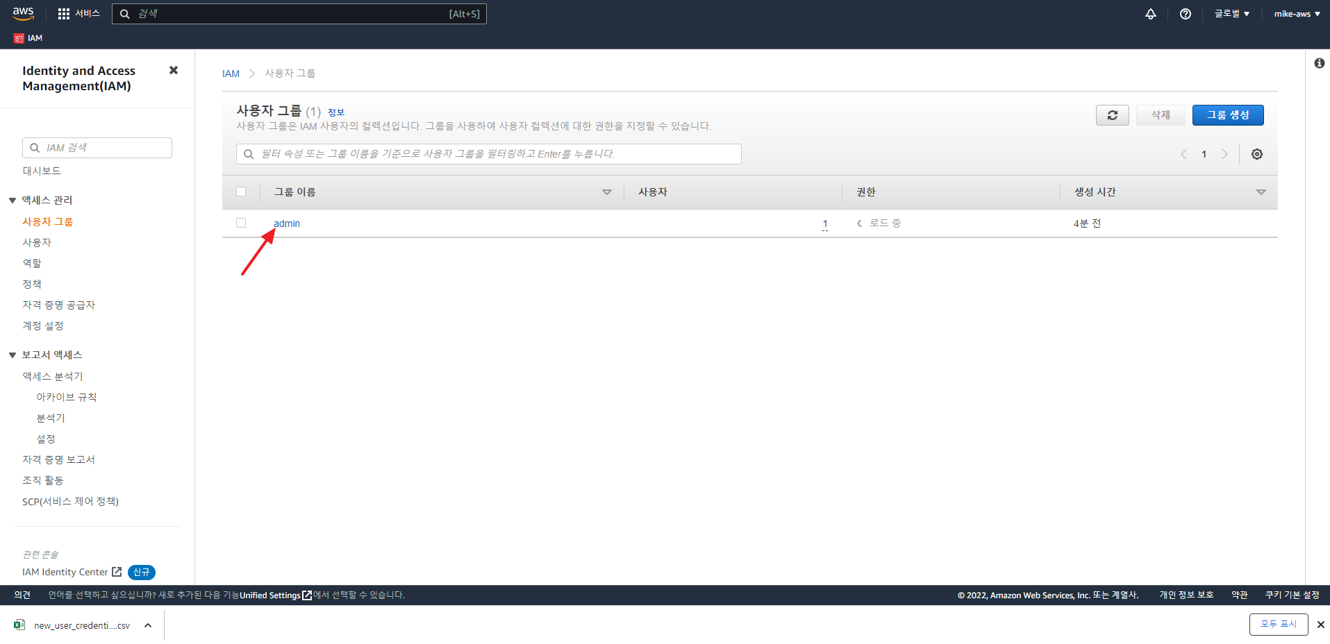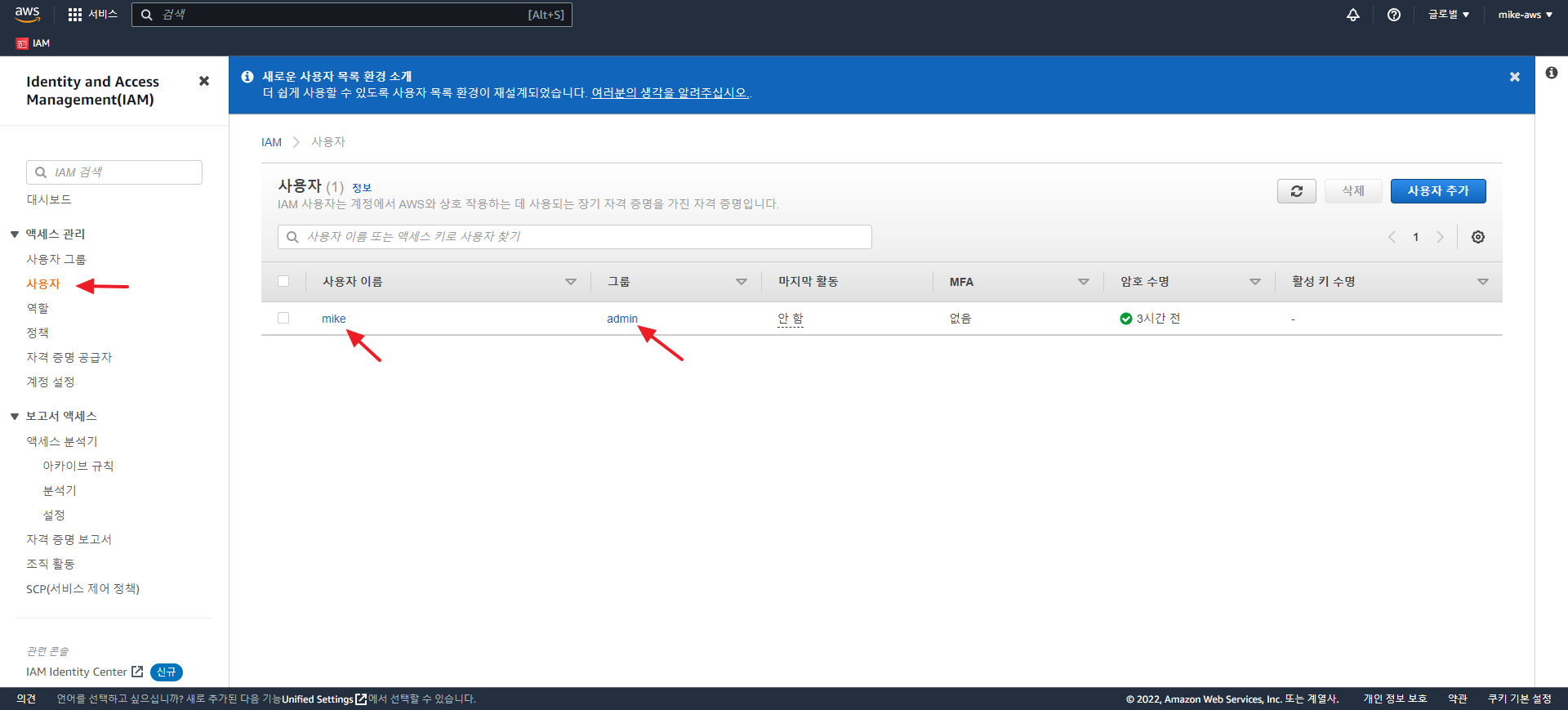 새로운 사용자에 새로운 그룹이 할당된것을 볼 수 있다. mike 에 admin 그룹/정책이 할당된 것을 볼 수 있다.