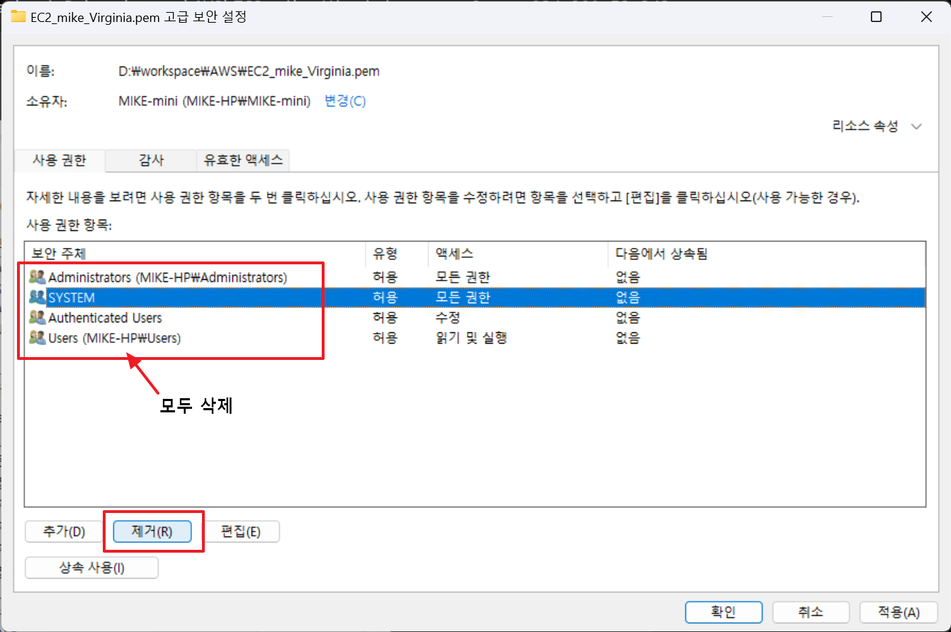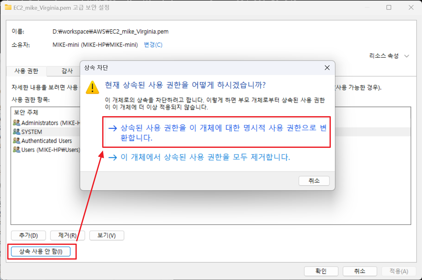 키파일 위치: D:\workspace\AWS\EC2_mike_Virginia.pem