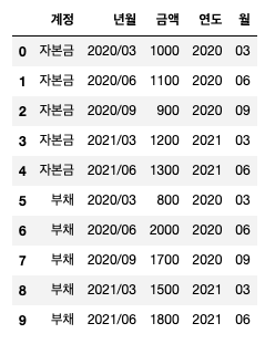 df_merged.columns = ['계정', "년월", "금액", "연도", "월"]