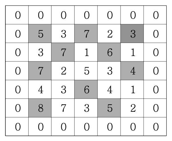 문제에서 설명한 '0' 으로 둘러싸인 2중 배열을 처러하는 코딩 예시.