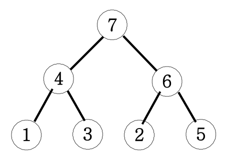 최대힙은 완전이진트리로 구현된 자료구조입니다. 그 구성은 부모 노드값이 왼쪽자식과 오른 쪽 자식노드의 값보다 크게 트리를 구성하는 것입니다. 그렇게 하면 트리의 루트(root)노드는 입력된 값들 중 가장 큰 값이 저장되어 있습니다. 예를 들어 5 3 2 1 4 6 7순으로 입력되면 최대힙 트리는 아래와 같이 구성됩니다.