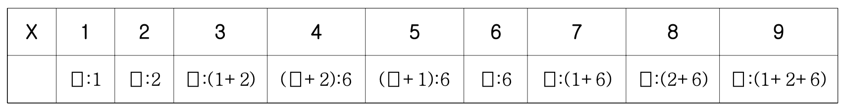 주어진 모든 추 무게의 합을 S라 하자. 예를 들어, 추가 3개이고, 각 추의 무게가 {1, 2, 6}이 면, S=9이고, 양팔저울을 한 번만 이용하여 1부터 S사이에 대응되는 모든 무게의 물을 다음과 같이 그릇에 담을 수 있다. X는 그릇에 담는 물의 무게이고, ⎕은 그릇을 나타낸다.