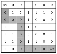 7*7 격자판 미로를 탈출하는 경로의 가지수를 출력하는 프로그램을 작성하세요. 출발점은 격 자의 (1, 1) 좌표이고, 탈출 도착점은 (7, 7)좌표이다. 격자판의 1은 벽이고, 0은 통로이다. 격 자판의 움직임은 상하좌우로만 움직인다. 미로가 다음과 같다면