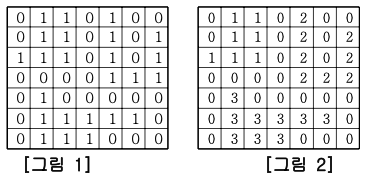그림2는 그림1을 단지별로 번호를 붙인 것이다. 지도를 입력하여 단지수를 출력하고, 각 단지 에 속하는 집의 수를 오름차순으로 정렬하여 출력하는 프로그램을 작성하시오.