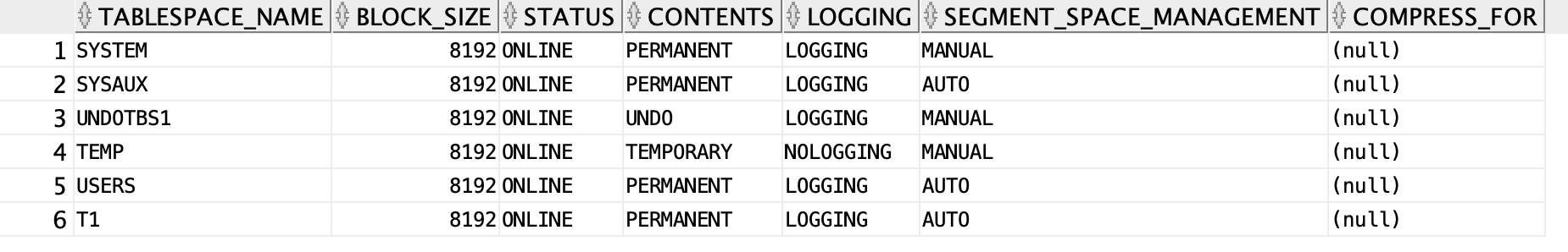 select TABLESPACE_NAME,BLOCK_SIZE,STATUS,CONTENTS,LOGGING,SEGMENT_SPACE_MANAGEMENt,COMPRESS_FOR