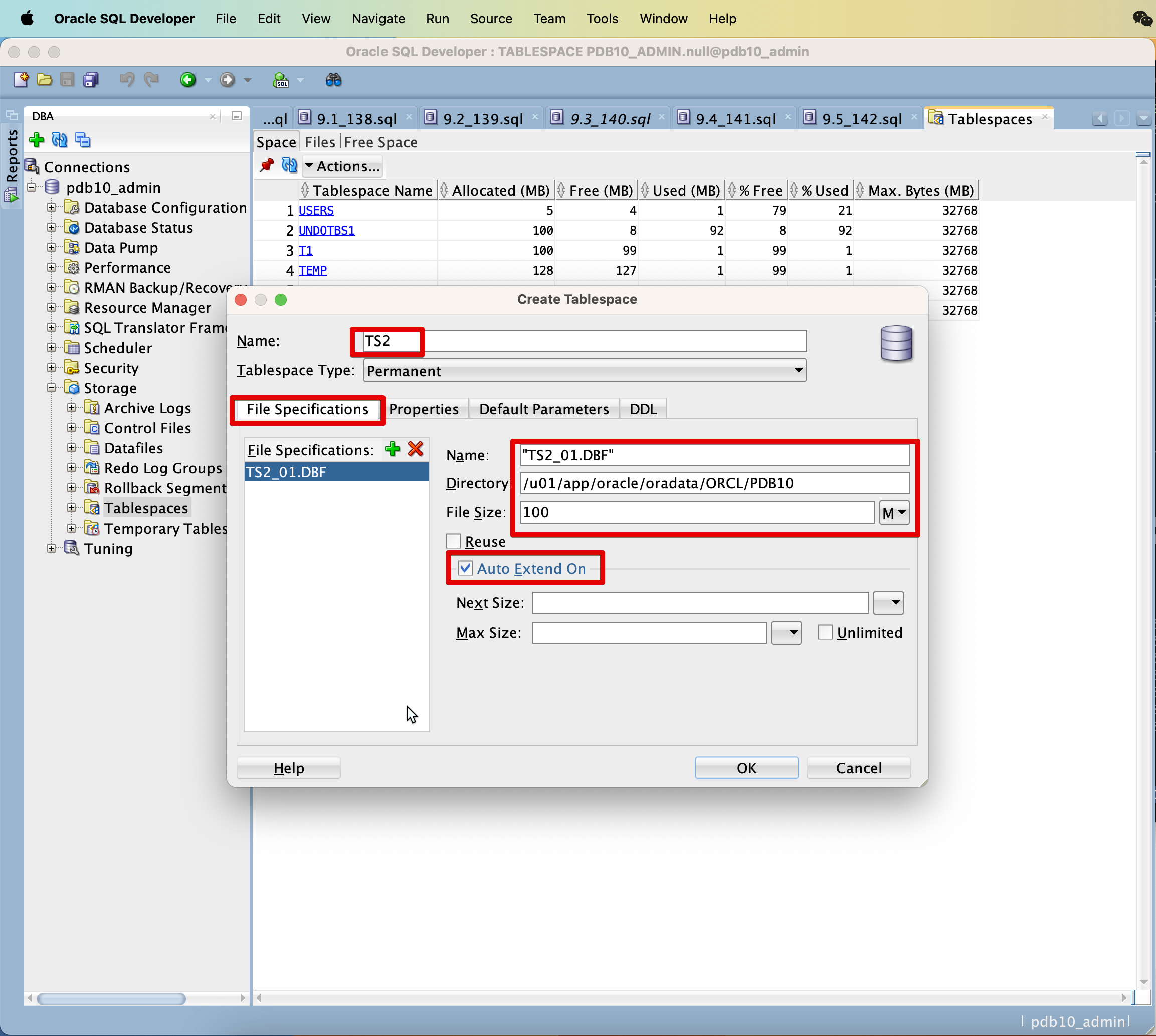 DATAFILE '/u01/app/oracle/oradata/ORCL/PDB10/TS2_01.DBF' SIZE 104857600 AUTOEXTEND ON