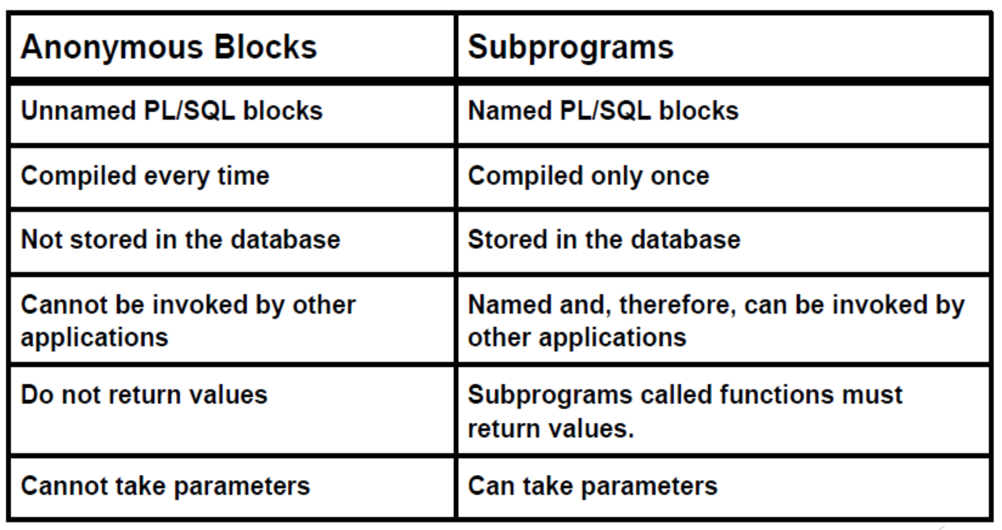 Anonymous Blocks 와 Subprograms 간의 차이점은 아래와 같다