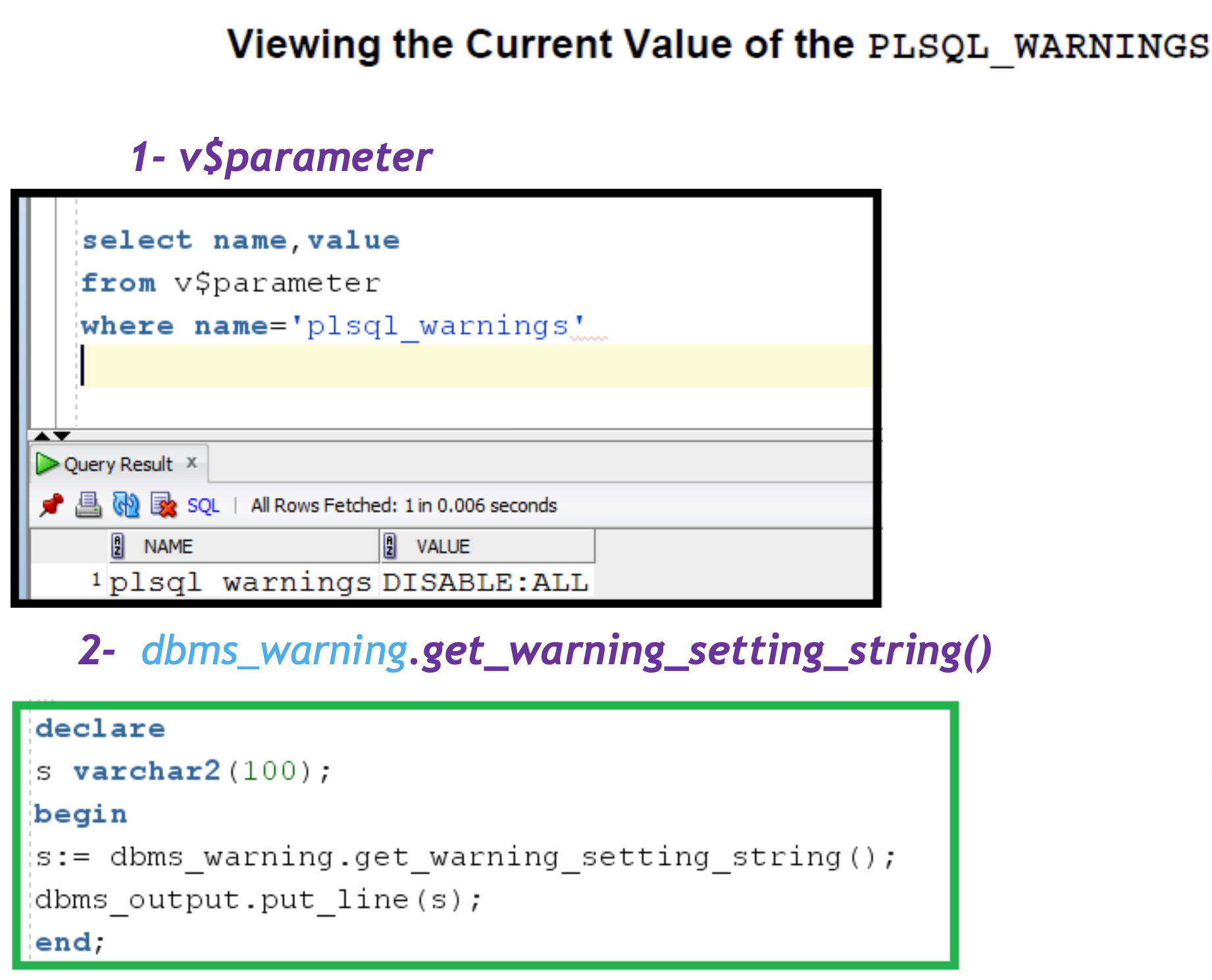 SELECT dbms_warning.get_warning_setting_num(6002)