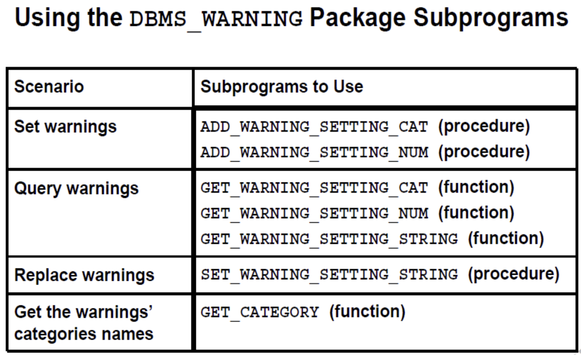 dbms_warning.get_category(warning_number IN PLS_INTEGER)
