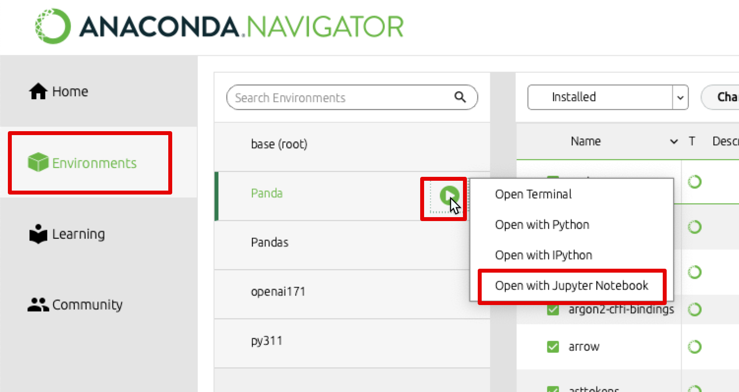 - 2. Anaconda.Navigator 에서 Environments > 가상환경 선택 > 'Open with Jupyter Notebook'
