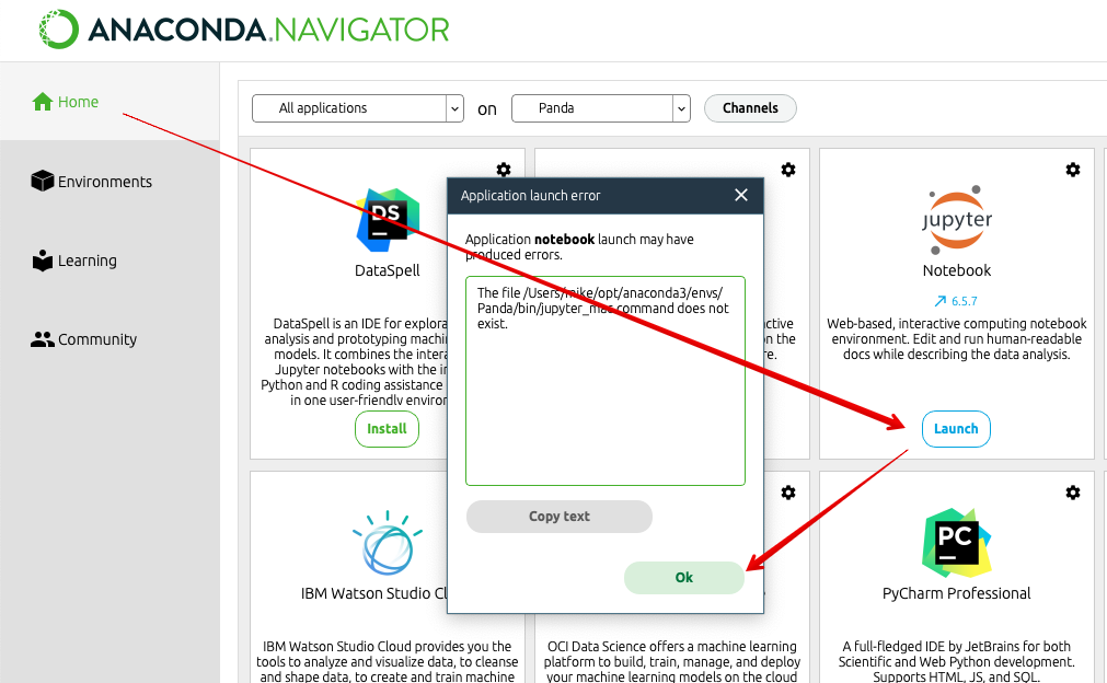 - 3. Anaconda.Navigator 에서 Home > 가상환경 > 'Jupyter Notebook' 클릭 경우, 오류가 발생합니다.