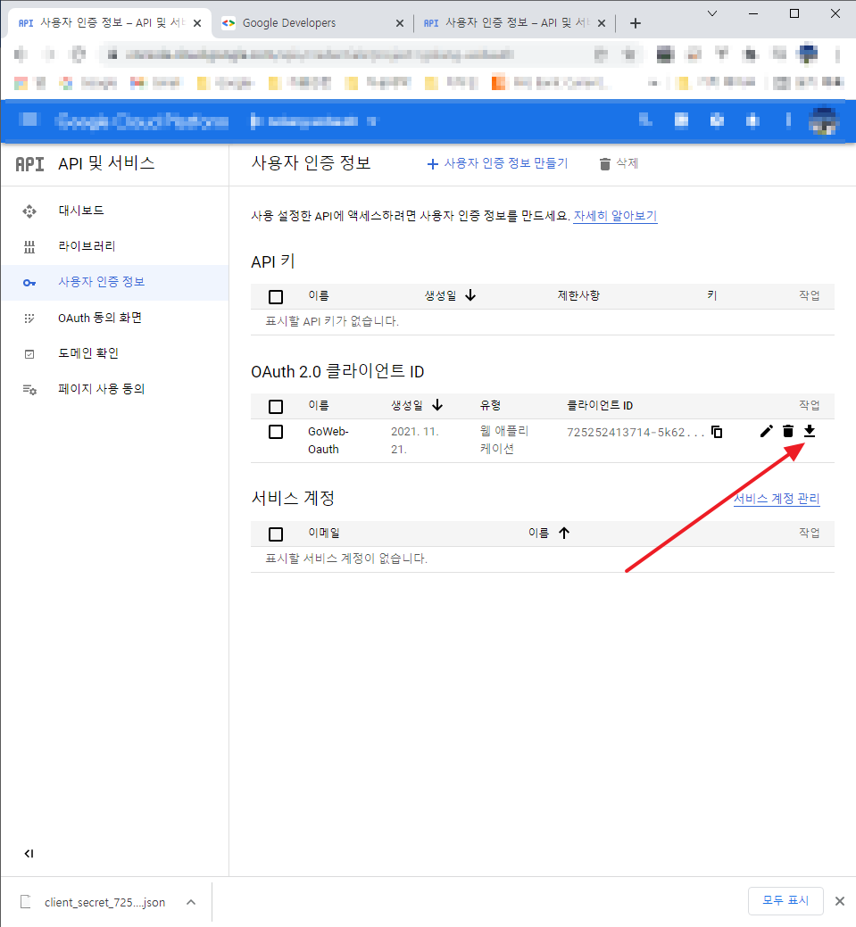 ID와 KEY를 기억하지 못한다면, 아래의 다운로드 버튼을 통해서 확인가능하다