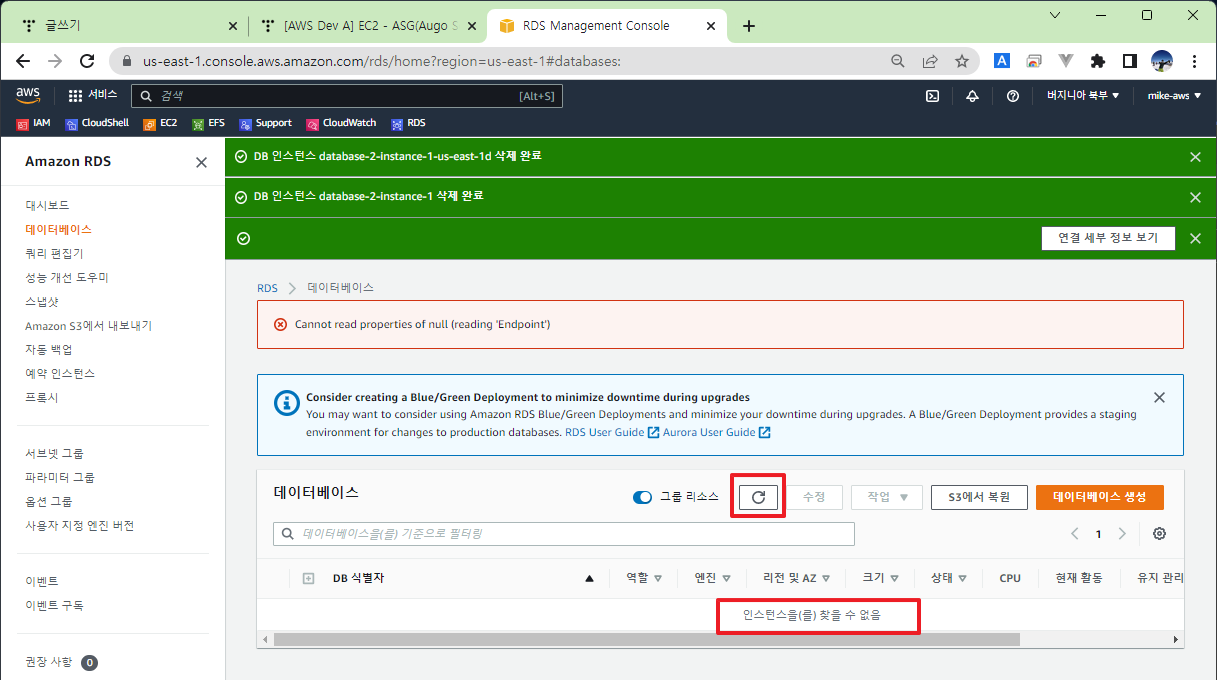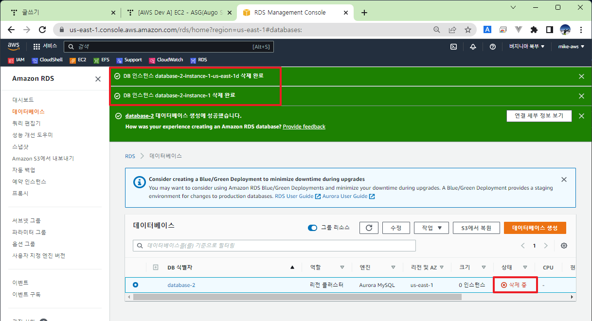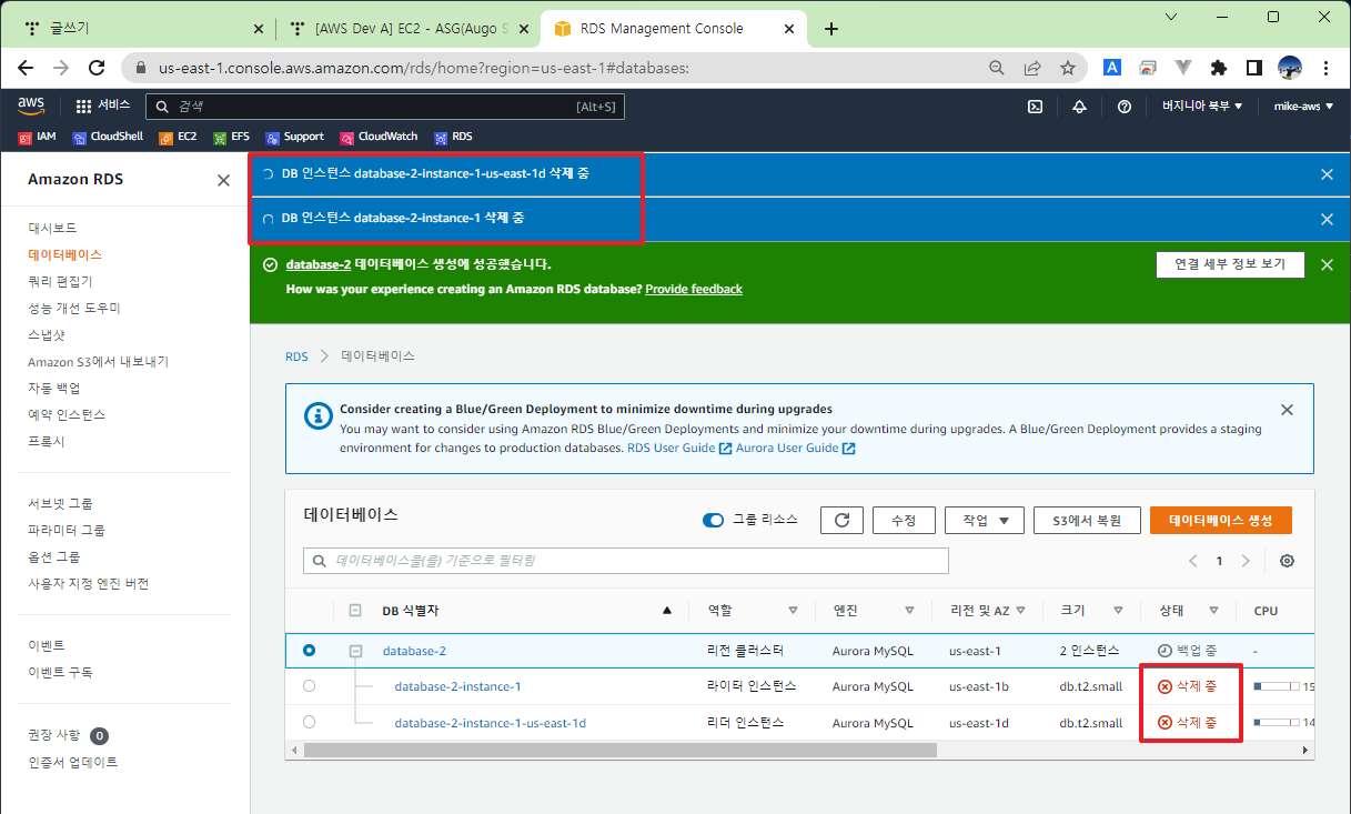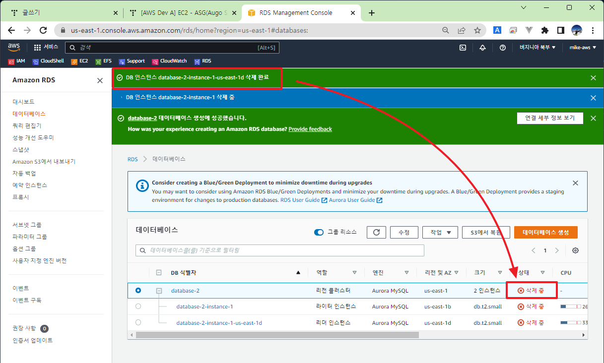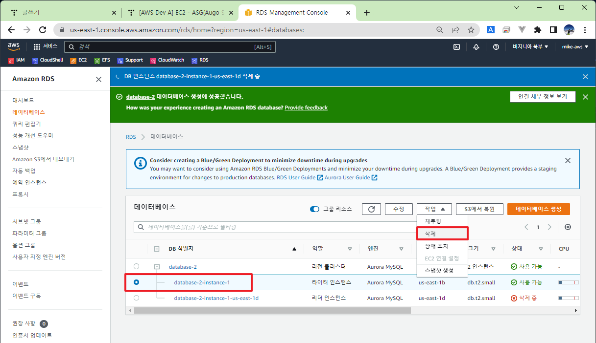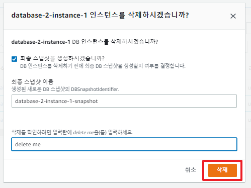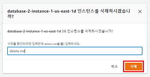 메인 DB 인스턴스는 읽기/쓰기 인스턴스를 삭제하면 자동으로 삭제된다.