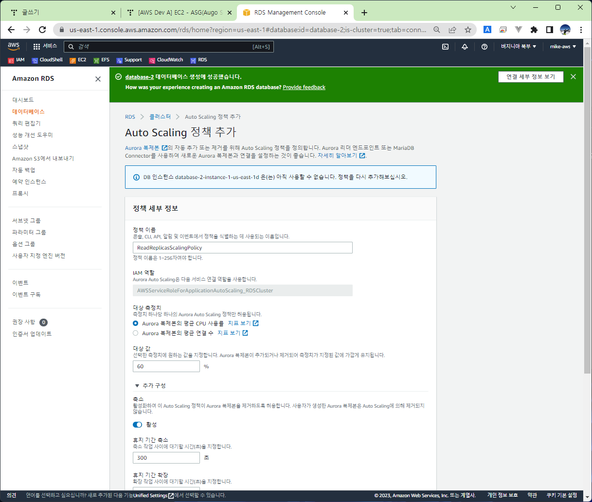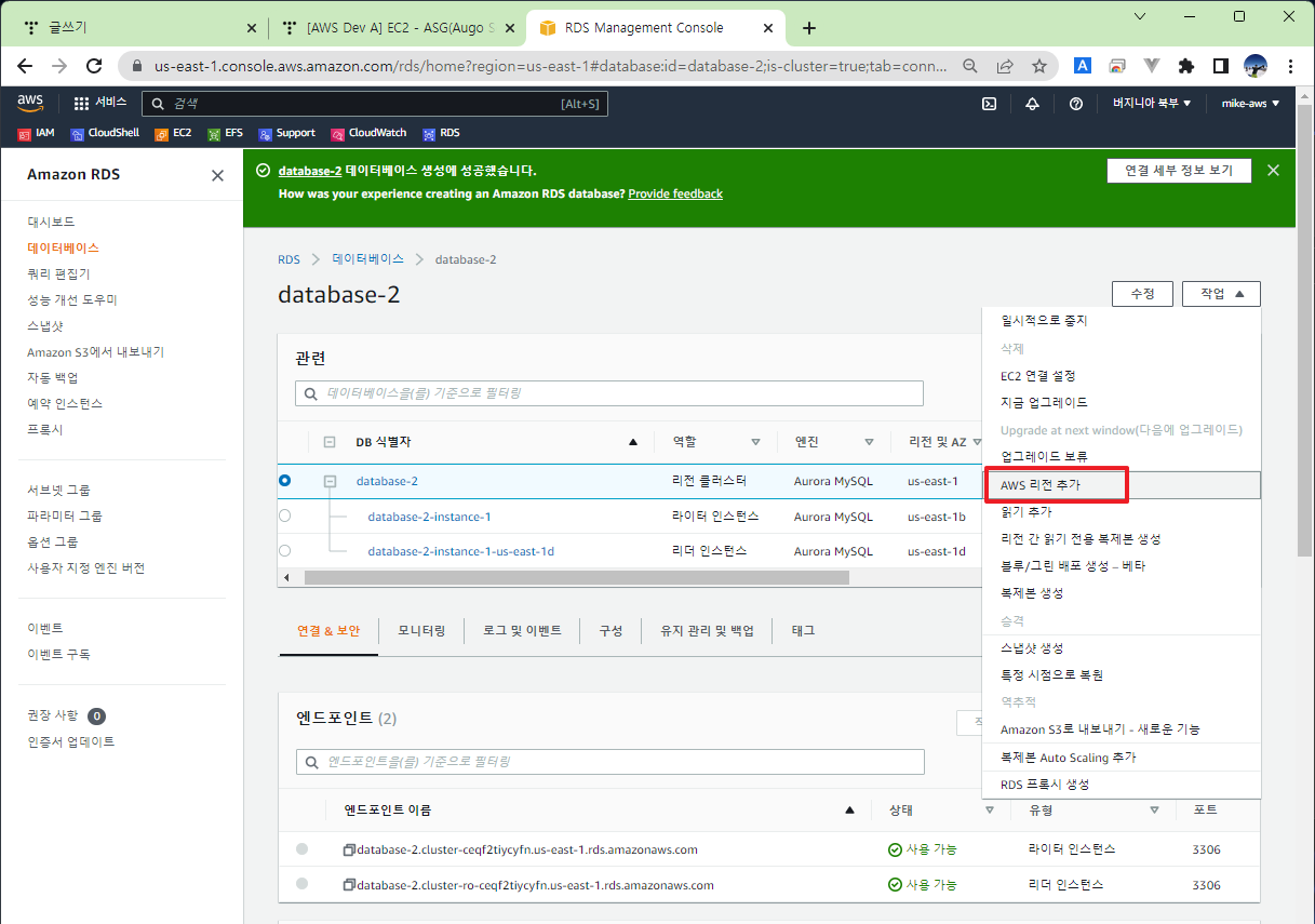 DB 인스턴스가 기준을 충족하지 못해서 리전 추가를 하려면 수정해야 한다.